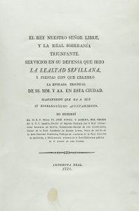1824. (SEVILLA). GOVEA Y AGREDA, José [Ayuntamiento de Sevilla]: EL REY NUESTRO SEÑOR LIBRE Y LA REAL SOBERANIA TRIUNFANTE. SERVICIOS EN SU DEFENSA LA LEALTAD SEVILLANA Y FIESTAS con que celebró la entrada triunfal de SS.MM. y AA. en esta ciudad....