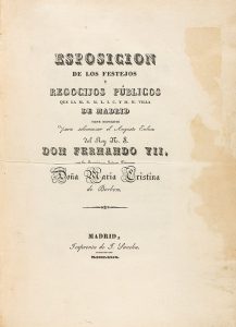 1829. (EFIMERA-MADRID). ESPOSICION DE LOS FESTEJOS Y REGOCIJOS PUBLICOS QUE LA M.N.M.L.I.C. Y M.H. VILLA DE MADRID TIENE DISPUESTOS PARA SOLEMNIZAR EL AUGUSTO ENLACE DEL REY M.S. DON FERNANDO VII, CON LA SERENISIMA SEÑORA PRINCESA DOÑA MARIA...
