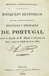 1834. (PORTUGAL). BOSQUEJO HISTORICO DE LOS ACONTECIMIENTOS POLITICOS Y MILITARES DE PORTUGAL DESDE LA LLEGADA DE D. MIGUEL A ESTE PAIS EN 1828, HASTA LA SALIDA DE EL EN 1834. Sevilla: Imp. a cargo de Garcia, reimpreso, 1834. 12º. 47 p., 1 h. Enc....