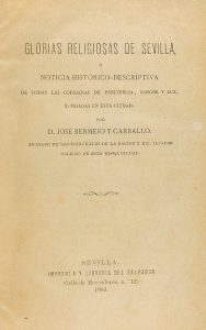 1882. (SEVILLA-RELIGION). BERMEJO Y CARBALLO, JOSE: GLORIAS RELIGIOSAS DE SEVILLA O NOTICIAS HISTORICO-DESCRIPTIVA DE TODAS LAS COFRADIAS DE PENITENCIA, SANGRE Y LUZ, FUNDADOS EN ESTA CIUDAD. Sevilla: Imp. y Libr. del Salvador, 1882. 8º mayor. VII...