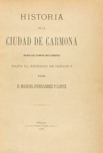 en media piel. Ex-libris del Marqués del Saltillo en las guardas. Manuel Fernández y López, médico carmonense, vicepresidente de la Sociedad Arqueológica de Carmona desde su fundación en 1885 y presidente de ésta desde 1888 hasta su fallecimiento en 1905, mandó imprimir en 1886 su obra Historia de la ciudad de Carmona en el sevillano establecimiento tipográfico de Gironés y Orduña, aqui el autor expone de forma detallada el devenir de la ciudad desde la dominación romana, recoge diferentes noticias sobre los monumentos de la urbe, describe las excavaciones arqueológicas realizadas en la zona, los hallazgos en éstas y estudia la historia de las familias e hijos ilustres de la villa. Acompañan al texto varias láminas con grabados de las monedas de Carmo, de la tumba de Quinto Postumio, del escudo de armas de Carmona y un plano del Alcázar de esta ciudad.