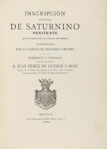 1890. (MERIDA). INSCRIPCION DEL SEPULCRO DE SATURNINO PENITENTE QUE SE HALLO EN LA CIUDAD DE MERIDA. Ilustr. por D. García de Salcedo Coronel. Reimpresa a expensas del excmo. señor D. Juan Pérez de Guzmán y Boza. Sevilla: Of. de E. Rasco, 1890....
