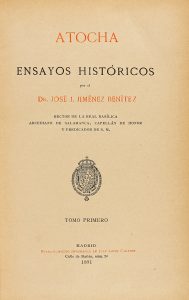 1891. JIMENEZ BENITEZ, JOSE: ATOCHA ENSAYOS HISTORICOS. Madrid: Tip. Juan López Camacho, 1891. 2 vols. en 8º mayor. I: 704 p.; II: 703 p. y una fotografía de la basílica de Ntra. Sra. de Atocha, de J. Laurent. Encuadernados en plena piel con...