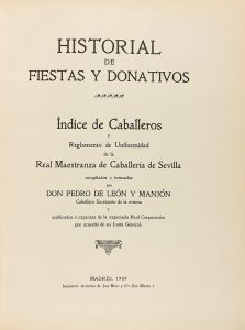 1909. (SEVILLA-REAL MAESTRANZA). LEON Y MANJON, PEDRO DE: HISTORIAL DE FIESTAS Y DONATIVOS. Indice de caballeros y reglamento de Uniformidad de la Real Maestranza de Sevilla recopilados y formados por... Madrid: Imp. Artística de José Blass y Cia,...