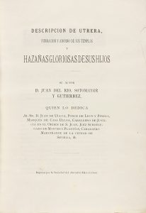 1910 ca. (UTRERA). RIO SOTOMAYOR Y GUTIERREZ, JUAN DEL: DESCRIPCION DE UTRERA, FUNDACION Y ADORNO DE SUS TEMPLOS Y HAZAÑAS GLORIOSAS DE SUS HIJOS. Sevilla: Archivo Hispalenses, s.a. 4º menor. IX + 303 p., 1 h. Enc. en media piel, tejuelo, corte...