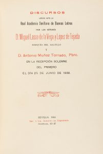 1922. (ENCUADERNACION-SEVILLA). DISCURSOS LEIDOS ANTE LA REAL ACADEMIA SEVILLANA DE BUENAS LETRAS POR LOS SEÑORES D. MIGUEL LASSO DE LA VEGA Y LOPEZ DE TEJADA MARQUES DEL SALTILLO Y DON ANTONIO MUÑOZ TORRADO, Pbro. Sevilla: Imp. y Lib. Sobrino de...