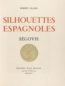 1949. (SEGOVIA). GILLON, ROBERT: SILHOUETTES ESPAGNOLES. SEGOVIE. Bruxelles: Editions Willy Balasse, 1949. 4º mayor. 193 p., 1 h. Culs-de-lampe grabados por Gilbert Poilliot. Ilustr. de fotografías en texto, algunas a plena página. Enc. en plena...