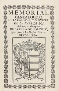 1747. (EJECUTORIA-GENEALOGIA-SALTILLO). MEMORIAL GENEALOGICO DE LA CALIDAD, Y SERVICIOS DE LA CASA DE LOS SEÑORES Y MARQUESES DE LA VILLA DEL SALTILLO. Carmona: 15 de Enero de 1747. Folio menor. 31 p. impresas. Escudo en portada. Blanco papel....