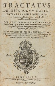 1622. (HISTORIA). GARSIAM A SAAVEDRA, IOANNEM: TRACTATUS DE HISPANORUM NOBILITATE, ET EX EMPOTIONE, SIVE AD PRAGMATICAM CORDUBENSEM... Matriti: apud viduam Ferdinandi Correa, 1622. 4º mayor. 8 h. + 216 fol. Escudo grabado en portada. Texto a dos...