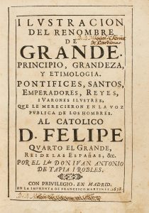 1638. (HISTORIA). TAPIA I ROBLES, IUAN ANTONIO: ILUSTRACION DEL RENOMBRE DE GRANDE PRINCIPIO, GRANDEZA Y ETIMOLOGIA. PONTIFICES, SANTOS, EMPERADORES, REYES, I VARONES ILUSTRES, QUE LE MERECIERON EN LA VOZ PUBLICA DE LOS HOMBRES AL CATOLICO D. FELIPE...