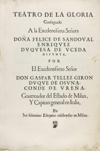 1671 ca. TELLEZ GIRON, GASPAR: TEATRO DE LA GLORIA CONSAGRADO A LA EXCELENTISIMA SEÑORA DOÑA FELICE DE SANDOVAL ENRIQUEZ DUQUESA DE UCEDA DIFUNTA (...) EN SUS ESEQUIAS CELEBRADAS EN MILAN. S.l. s.e., s.a. Folio. 2 h. + 109 p. Restos de antiguos...