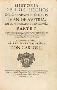 1673. FABRO BREMUNDAN, FRACISCO: HISTORIA DE LOS HECHOS DEL SERENISSIMO SEÑOR DON JUAN DE AUSTRIA EN EL PRINCIPADO DE CATALUÑA. PARTE I. Çaragoça: Emprenta de Diego Dormer, 1673. 4º mayor. 5 h. + 458 p. Viñetas. Papel tostado, manchas. Enc....