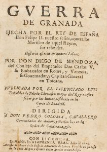 1674. (HISTORIA ESPAÑA). MENDOZA, DIEGO DE: GUERRA DE GRANADA HECHA POR EL REY DE ESPAÑA D. FELIPE II nuestro Señor, contra los moriscos de aquel Reyno, sus rebeldes. Madrid: en la Imprenta Real, 1674. 8º mayor. 12 p. + 147 h. Capitales. Texto...