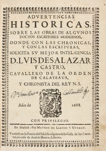 1688. (HISTORIA). SALAZAR Y CASTRO, LUIS DE: ADVERTENCIAS HISTORICAS SOBRE LAS OBRAS DE ALGUNOS DOCTOS ESCRITORES MODERNOS, DONDE CON LAS CHRONICAS, Y CON LAS ESCRITURAS, SOLICITA SU MEJOR INTELIGENCIA... Madrid: Matheo de Llanos y Guzman, 1688. 8º...