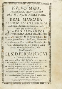 1751. (HISTORIA). NUEVO MAPA, DESCRIPCIÓN ICONOLÓGICA DEL MUNDO ABREVIADO. REAL MÁSCARA DE SIMBÓLICOS TRIUMPHOS EN FESTIVA OSTENTACIÓN DEL MÁS PLAUSIBLE CULTO POR MEDIO DE LOS QUATRO ELEMENTOS, QUE OFRECIÓ LA LEALTAD AMANTE DE LOS...