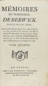 1778. (HISTORIA). BERWICK: MEMOIRES DU MARECHAL DE BERWICK. Suisse: chez les Libraires Associés, 1778. 2 tomos en 1 vol. en 8º. I: XXXVI + 348 p.; II: 363 p. Enc. en plena piel, nervios, doble tejuelo, hilos dorados, cortes pintados. Escudo del...