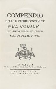 1783. (ORDEN DE MALTA). COMPENDIO DELLE MATERIE CONTENUTE NEL CODICE DEL SACRO MILITARE ORDINE GEROSOLIMITANO. Malta: Stamperia del Palazzo, 1783. Folio. IX + 162 p. Marca tipográfica en portada. Blanco papel con amplios márgenes. Portadas con...