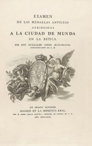 1799. LOPEZ BUSTAMANTE, GUILLERMO: EXAMEN DE LAS MEDALLAS ANTIGUAS ATRIBUIDAS A LA CIUDAD DE MUNDA EN LA BETICA. Madrid: Imprenta Real, 1799: Folio. XXIV + 99 p., 2 tablas plegadas con grabados al cobre. Contiene, además, tres grabados al cobre...