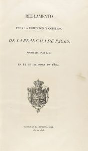 1804. REGLAMENTO PARA LA DIRECCION Y GOBIERNO DE LA REAL CASA DE PAGES, aprobado por S.M. en 17 de Diciembre de 1804. Madrid: en la Imprenta Real, 1805. Folio mayor. 4 p. + 72 p. Escudo grabado en portada y una Viñeta calcográfica grabada por...