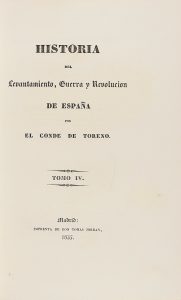 1835. (CARLISMO). CONDE DE TORENO: HISTORIA DE LEVANTAMIENTO, GUERRA Y REVOLUCION DE ESPAÑA. Madrid: Imp. de Don Tomas Jordan, 1835. 5 vols. en 8º mayor. I: 3 h.+ 411 p., 125 p.; II: 394 p., 46 p.; III: 498 p., 54 p., 2 h.; IV: 416 p., 18 p., 1...