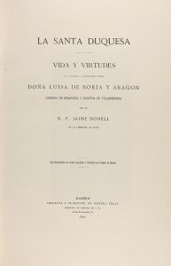 1892. NONELL, JAIME: LA SANTA DUQUESA. VIDA Y VIRTUDES DE LA VENERABLE Y EXCELENTISIMA SEÑORA DOÑA LUIDA DE BORJA Y ARAGON CONDESA DE RIBAGORZA Y DUQUESA DE VILLAHERMOSA. Madrid: Imp. y Fun. de Manuel Tello, 1892. Folio menor. 346 p., 1 h....
