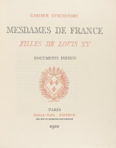 1910. (HISTORIA DE FRANCIA). STRYIENSKI, CASIMIR: MESDAMES DE FRANCE FILLES DE LOUIS XV. DOCUMENTS INDERITS. Paris: Emile-Paul, edit., 1910. 4º mayor. VIII + 354 p. Láms. Enc. en plena piel, nervios, lomo cuajado. Hilos, cejas, corte superior...