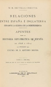 1911. (HISTORIA). VILLA-URRUTIA: RELACIONES ENTRE ESPAÑA E INGLATERRA DURANTE LA GUERRA DE LA INDEPENDENCIA. APUNTES PARA LA HISTORIA DIPLOMATICA DE ESPAÑA DE 1808 A 1814. Con prólogo del Excmo. Sr. D. Antonio Maura. Madrid: Librería de Beltran,...