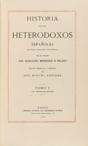 1911-1928. HISTORIA DE LOS HETERODOXOS ESPAÑOLES. Madrid: Libr. General de Victoriano Suarez, 1911-1928. 5 vols. en 4º menor. I: 516 p., 2 h.; II: 362 p., CLVII p., 1 h.; III: 420 p., CLVIII p., 1 h.; IV: 436 p., LXXXI p., 1 h.; V: 441 p., LII p.,...
