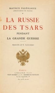 1921. (HISTORIA). PALEOLOGUE, MAURICE [Ambassadeur de France]: LA RUSSIE DES TSARS PENDANT LA GRANDE GUERRE. Paris: Plon-Nourrit, 1921. 3 vols. en 8º. 4º menor. I: 377 p., 1 h.; II: 346 p., 1 h; III: 356 p., 1 h. En cada vol. frontis fotográfico....