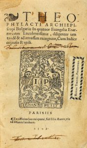 1549. (RELIGION). THEOPHYLACTI ARCHIEPISCOPI BULGARIAE IN QUATOR EVANGELIA ENARRATIONES LUCULENTISSIMAE, DILIGENTER IAM TAUDEM & AD AMUSSIM RECOGNITAE, CUM INDICE COPIOSO & UTILI. Parisiis: ex. officina Ioannis parvi, sub Iulio Aureo, 1549. 8º...
