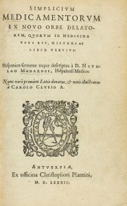 1582. (MEDICINA). MONARDES, NICOLAO: SIMPLICIUM MEDICAMENTORUM EX NOVO ORBE DELATORUM QUORUM IN MEDICINA USUS EST, HISTORIAE LIBER TERTIUS. Antuerpiae: ex officina Christophori Pantini, 1582. 8º menor. 47 p. Marca tipográfica en portada. Grabados...