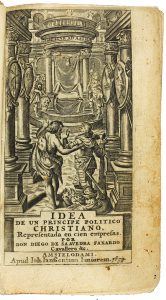 1659. (EMBLEMAS). SAAVEDRA FAXARDO, DIEGO DE: IDEA DE UN PRINCIPE POLITICO CHRISTIANO. Representada en cien empresas. Amstelodami: apud Ioh. Iansonium Iuniorem, 1659. 12º. Portada grabada + 17 h. + 983 p. Ilustr. con 100 viñetas grabadas al cobre,...