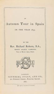 1860. (VIAJES). ROBERTS, RICHARD: AN AUTUMN TOUR IN SPAIN IN THE YEAR 1859. London: Saunders, Otley and Co., 1860. 8º mayor. XX + 535 p. Ilustr. con 7 láms. litográficas. Enc. en plena piel, nervios, tejuelo, hilos dorados, cortes pintados.