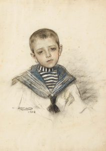 1908. CASAS, RAMON [FIRMADO]: RETRADO DEL NIÑO CODINA CASAS, SOBRINO DE RAMON CASAS, A LA EDAD DE 7 a 10 AÑOS. Lápiz, pastel y sanguina sobre papel verjurado de la casa Guarro con marca de agua Ingres. 42x 56 cm. Diminutos puntos de óxido....