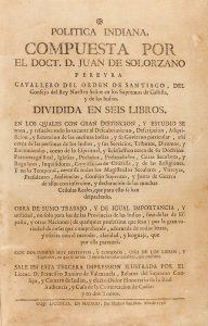 1736. (CONQUISTA AMERICA). SOLORZANO, JUAN DE: POLITICA INDIANA COMPUESTA POR EL DOCTOR... Madrid: Ed. Matheo Sacristan, 1736. 2 vol. en folio mayor. I: 11 h. + 458 p.; II: 4 h. + 704 p. Enc. en pasta española. Tejuelo. Papel levemente tostado.