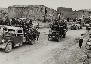 1937. CENTELLES, AGUSTI: CONVOY MILITAR FRENTE ARAGON, 25 septiembre, 1937. Gelatina de plata, 12 x 17 cm, papel 12,5 x 18 cm, sello húmedo del fotógrafo, tiraje de la década de 1970.