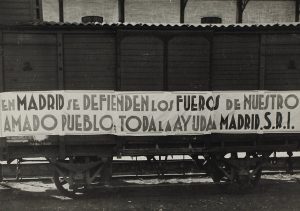 CENTELLES, AGUSTÍ: VAGÓN DE TREN AYUDA A MADRID Gelatina de plata, 12 x 17 cm, 12,5 x 18 cm, sello húmedo del fotógrafo, tiaje de la década de 1970.