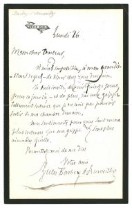 la part de notre gouvernement »… Il signe « Jules B. d’Aurevilly » puis « Conseiller Crespel ». Lundi 26, à un Docteur. Il ne peut dîner chez lui demain, à son « grandissime regret », car il est déjà invité depuis longtemps et souffre de plus d’une « grippe tellement intense » qu’il ne pourra pas quitter sa chambre. « Mes sentiments pour vous sont plus intenses que ma grippe & sont plus agréables qu’elle »…