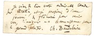 Charles BAUDELAIRE (1821-1867) poète. L.A.S. « Ch. Baudelaire » ; 1 page oblong 4 x 10 cm. Court billet griffonné sur un petit morceau de papier, probablement glissé sous un porte. « Je viens de lire votre admirable étude sur Aretin, et je...