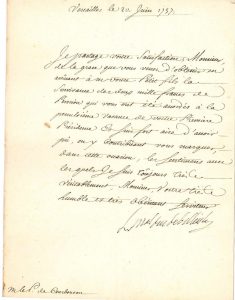 figurent des lettres à M. de Courbouzon (3, 1755-1757), la princesse d’Armagnac (1758, attribution d’une gratification annuelle à un capitaine du régiment de cavalerie de Noailles), aux conseillers députés des Princes et États du Cercle du Haut Rhin (1759, assurant son soutien aux armées assurant la défense de l’Empire), à M. de Calonne procureur général du Parlement de Flandres (1759, envoi de lettres patentes du roi pour enregistrement au Parlement), au comte de Lordat (2, 1760, dont envoi d’une copie de sa lettre à M. de la Galaizière, chancelier du roi de Pologne, relative aux intentions du Roi pour les gendarmes souhaitant intégrer les gardes du corps), etc. On joint une notice biographique imprimée extraite de la Galerie françoise (1770).