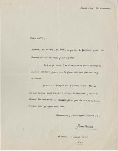 Au sujet de sa candidature à l’Académie Française (il sera élu le 11 juin 1931). 11 septembre [1930], à Léon Barthou, lui annonçant sa candidature : « Je me présente au fauteuil de Porto-Riche. C’est Doumic […] qui me l’a lui-même conseillé » ; il ne veut pas attendre la déclaration de vacance ni sa lettre officielle de candidature pour faire connaître cette décision, afin d’empêcher d’autres candidatures… – Il envoie la liste de ses partisans et de ceux d’Abel Bonnard et d’Edmond de Fels. « Plus les douteux parmi lesquels j’ai compté Bergson et Jullian, qui ne voteront vraisemblablement pas (Jullian est pour moi) »…