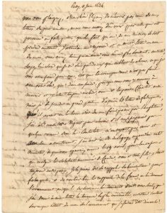 puisque vous vous y ennuyez à mourir et y êtes toujours malade, vous et la pauvre Clairette »… Il rapporte ses démarches pour faire rentrer son mari en France : « Ce qui m’a enhardi à faire cette tentative c’est que deux fois j’ai écrit en faveur de M. de Rigny pour lui procurer des voix aux élections, avant la révolution de juillet. […] Messieurs les Ministres ont tous encore des égards pour moi ; je n’en abuse pas ; j’en use avec précaution »… Il lui donne des nouvelles de sa pauvre tante qui, dit-on, perd la tête : « M. Odier l’a mise à la porte assez brutalement. […] par surcroît elle s’est mise à refleurir d’un nouvel amour à 63 ans. Son objet est un tout jeune homme, fort spirituel, assure-t-on, mais qui par ses assiduités s’expose à bien des calomnies : on va jusqu’à prétendre qu’il fait un service payé. Je n’en crois rien »… Puis il évoque le pauvre Holstein, ancien saint-simonien : « Il a ici une réputation de nullité si bien établie, même parmi ses coreligionnaires, que je crains, malgré ses excellentes qualités, qu’il ne puisse facilement trouver à se pourvoir. Il a dû vous en conter de belles sur le Père Suprême et sa religion. Comme dit Fabreguettes : en dépit de beaucoup de sottises, il restera quelque chose de bon du St Simonisme »… Il donne des nouvelles de leurs relations, puis : « Je vous dirai que j’ai un illustre ami de plus ; c’est l’abbé de Lamennais, qui vient de se faire surnommer Isaïe au bonnet rouge, vous voyez que je pense à mon salut. Vous l’aimeriez bien : c’est un homme de cœur éloquent, espèce fort rare aujourd’hui »…