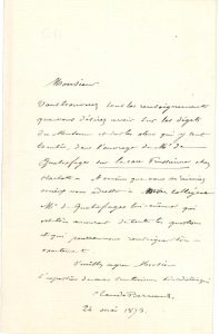 de M. de Ségur auprès du Pape Pie IX, en faveur de cet ami : « il est probable que la chose va se faire. Seulement le Pape […] a dit qu’il faut que dans ces cas ce soit la partie catholique qui intervienne. Il faudrait donc que Madame Moyse et Madame votre mère intervinssent et témoignassent du désir de l’union que vous, de votre côté, avez demandée »… 24 mai 1873. Il renvoie au livre sur La Race prussienne d’A. de Quatrefages pour tous renseignements « sur les dégâts du Muséum et sur les obus qui y sont tombés »…