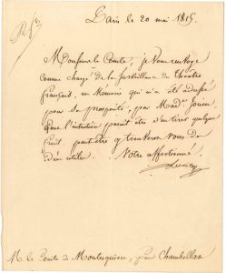 Lucien BONAPARTE (1775-1840) frère de Napoléon. [AF] L.S. « Lucien », Paris 20 mai 1815, au comte de Montesquiou, Grand Chambellan ; 1 page in-4. Il lui transmet, « comme chargé de la surveillance du Théâtre Français, un mémoire de Mme...
