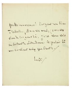 Lundi. « Quelle innocence ! L’argent va bien à Vitrolles ; il me va mal. Je ne veux rien de ces gens-là. J’irai vous voir en sortant de Notre-Dame. Ce palais là me convient mieux que l’autre ».