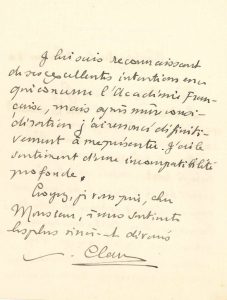 1er février. Il ne met pas en doute les intentions de l’abbé Bremond. « Mais son interview était nettement insultante pour moi et c’est ainsi que l’ont comprise plusieurs personnes qui m’en ont témoigné leur étonnement. J’ai moi-même écrit à l’abbé Bremond pour lui exprimer le mien. Mais je n’ai reçu aucune réponse. En tous cas cette petite affaire a eu un bon résultat, c’est qu’elle coupe court pour toujours à mes ambitions académiques. Si je suis traité avec un pareil manque d’égards par un homme que je croyais amicalement disposé à mon égard, que penser des autres ? Mes ambitions sont loin d’avoir un caractère assez ardent pour que je veuille m’imposer à la mauvaise volonté générale »… 28 mars. La lettre de l’abbé Bremond le rend bien confus. « Je vois que je m’étais ému bien à tort, mais on est plus sensible à l’égard des gens qui vous inspirent estime et affection. Exprimez-lui toutes mes excuses ainsi que l’espérance qu’il ne notera rien de cet incident dans son esprit comme dans le mien. Je lui suis reconnaissant de ses excellentes intentions en ce qui concerne l’Académie Française, mais après mûre considération j’ai renoncé définitivement à me présenter. J’ai le sentiment d’une incompatibilité profonde »…