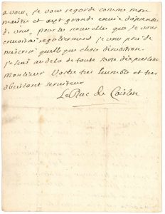 Belle et rare lettre sur la situation militaire. [« Une seule lettre du duc Pierre de Coislin est passée en vente », selon Raoul Bonnet.]