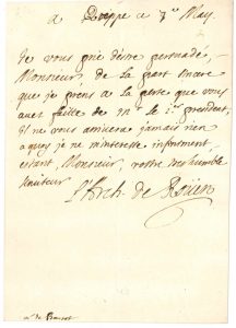 favorable, et qu’il soumet au Conseil… Dieppe 7 mai, condoléances à M. de Bautot, sur « la perte que vous avez faitte de Mr le 1er President »… Gatteville 25 avril, à un Procureur général, condoléances… Gaillon 26 mars, à M. d’Arbouville, dont le régiment arrive à Louviers : « Vous me ferez beaucoup de plaisir de vouloir bien donner les ordres necessaires pour empécher qu’on ne detruise le gibier que je fais conserver »… Plus 2 quittances de rentes, 5 février 1691 (cosignée par son frère Louis Colbert abbé de Bonport), et 3 juin 1698.