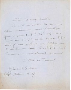 Colette de Jouvenel. 69 boulevard Suchet, à Jeanne Landre, dont elle reçoit une lettre « charmante mais hermétique. […] M’auriez-vous écrit sous l’empire de la boisson ? Si oui, je vous envie et vous félicite, car il est bon de boire »… 57 rue Cortambert, poignée de main à un ami. Castel-Novel, rendez-vous au Matin.