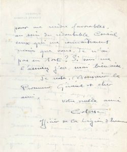 « Dans le temps où nous nous rencontrions souvent – c’est à Henry de Jouvenel que je dois de vous avoir connu – je vous saluais d’un “bonjour, mon cher Théo” […] Monzie compte me donner la cravate le mois prochain. Il aimerait que la proposition de mon nom au Conseil de l’Ordre trouvât un accueil unanime, ou quasi-unanime. C’est à vous que j’ai songé pour me rendre favorables, au sein du redoutable Conseil, ceux qui me connaîtraient moins que vous »… Elle signe : « votre vieille amie Colette officier de la Légion d’honneur ».